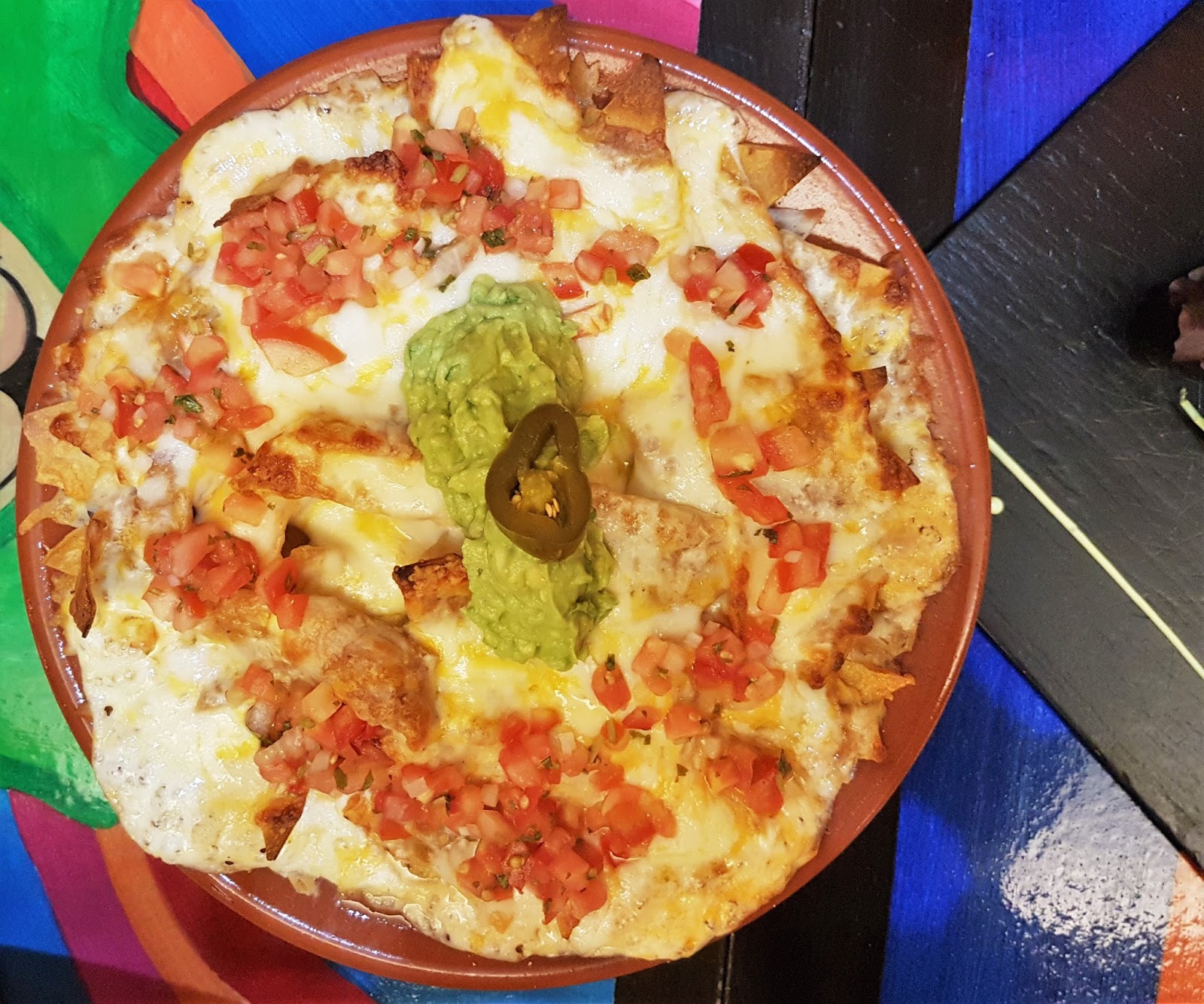 | Nachos con queso, frijoles, pico de gallo y jalapeños |